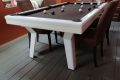 Original et contemporain, ce billard dispose de pieds asymétriques. Personnalisé en blanc avec un tapis chocolat foncé, ce billard américain mesure 2m20.